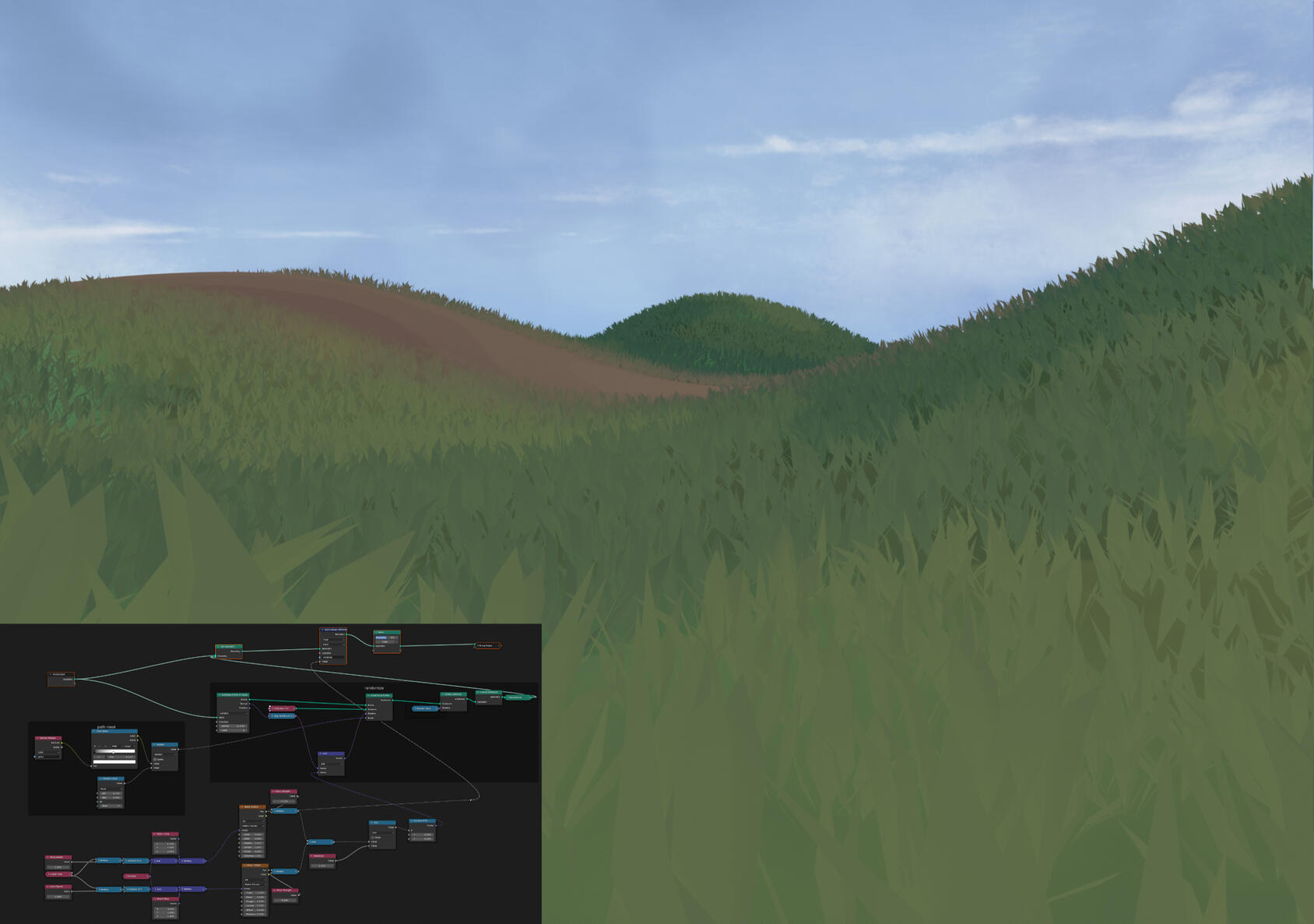 The grass itself is made through a cards system using geometry nodes and shader work to create a stylized cel-shaded effect.