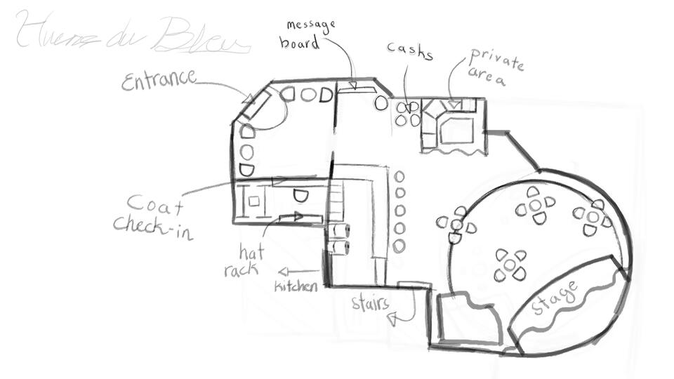 The initial 3D blockout made in Blender using the floor plan as a rough basis for the design. The layout of the building is what will remain mostly unchanged in the final Unreal project. The goal is to create handpainted and stylized props for the environment.