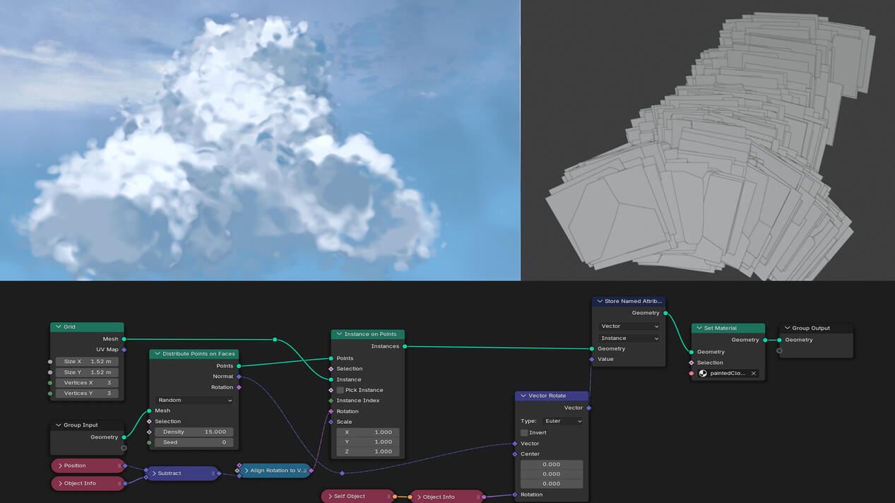 The clouds for this piece were created entirely using a mix of Blender's geometry nodes & shader work to stylistically emulate the painterly clouds of Ghibli.