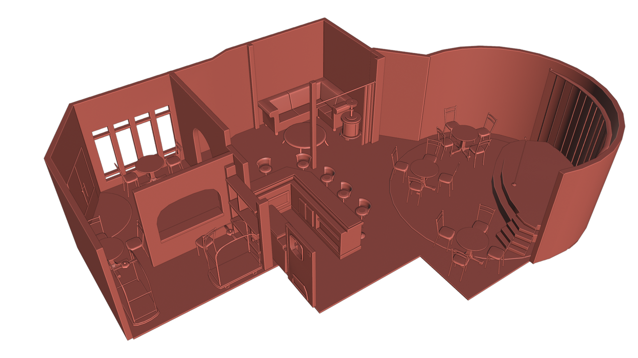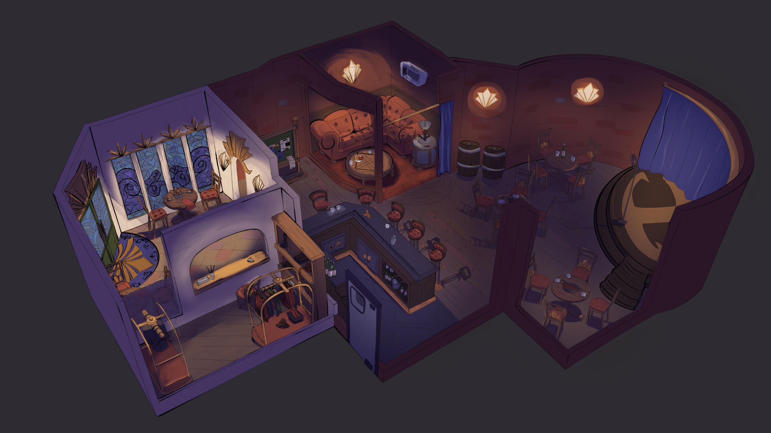 The initial 3D blockout made in Blender using the floor plan as a rough basis for the design. The layout of the building is what will remain mostly unchanged in the final Unreal project. The goal is to create handpainted and stylized props for the environment.