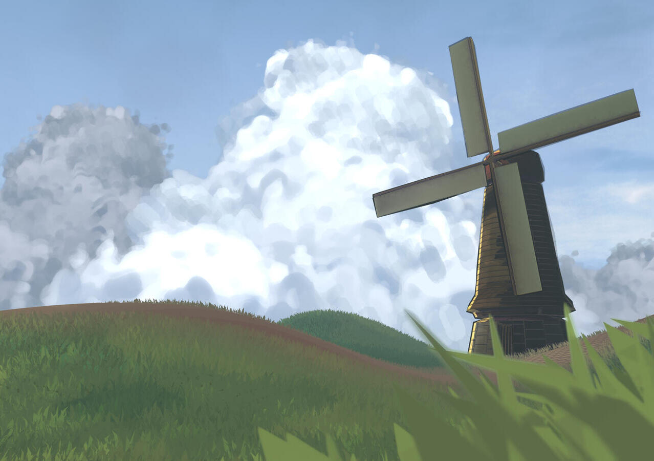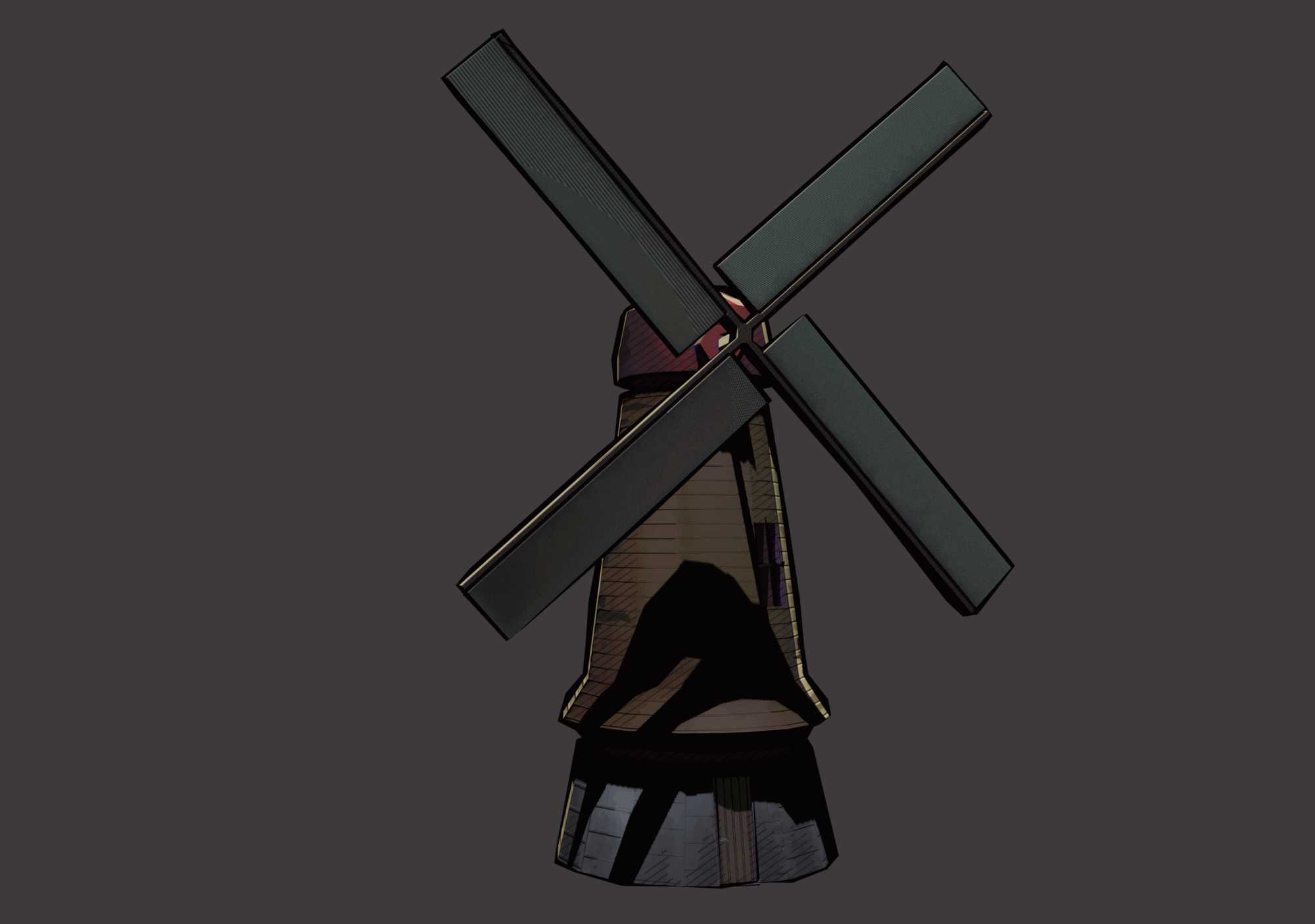 The key piece of this simple environment was the windmill. It was modeled with both handpainted textures and handpainted normals. Alongside that, the model uses a basic geometry node setup for its inverted hull style outline.